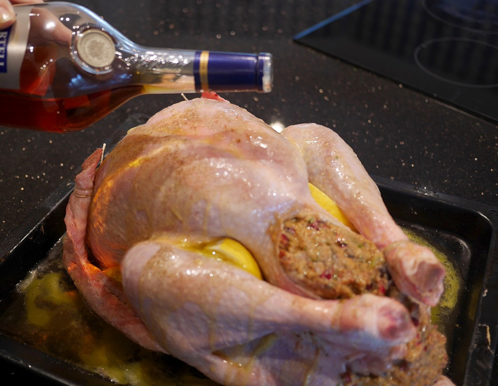 Tilsett vannet og resten av krydder i langpannen. Stek deretter kalkunen på 180 grader i 3 - 3,5 timer. Dette kommer selvsagt litt an på størrelsen, men beregn ca 30 min steketid pr kilo kalkun! OBS – og dette er viktig for å få en saftig og flott kalkun; hvert 20 minutt gjennom hele stekingen skal kraften som ligger i bunnen øses over kalkunen. Jeg bruker en mat pipette, men det går selvsagt fint også med en øse. Kalkun kan blir tørr om den stekes for mye. Sjekk ved å stikke en spiss kniv inn ved lårfestet, dersom det kommer ut klar væske er kalkunen ferdig. La kalkunen stå i minst 15 min før du skjærer i den.